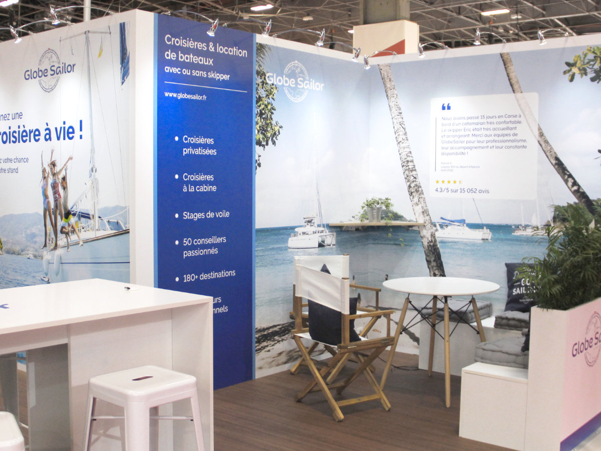 J'ai réalisé ces visuels de stand pour GlobeSailor, entreprise de croisière et de location de bateaux, dans le cadre du Salon Nautic 2022 de Paris.